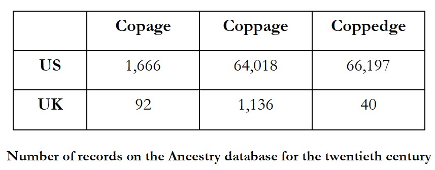 There have been Copages/Coppages in America since the middle of the seventeenth century and the number of Americans bearing this surname is now far higher than in the UK.