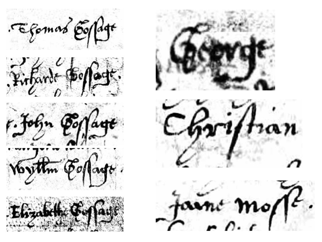 These five names from 16th-century records for Solihull were all transcribed as “Coppage”. However the entries on the right were written in the same hand and on close examination it becomes clear that the first letter is “G” (as in George) and not “C” (as in Christian). Furthermore the symbol in the middle of the surname is not “pp” but is “ss” (as in Jane Mosse). So these five individuals were not actually “Coppages” but were all named “Gossage” (a fairly common surname in this area at the time).