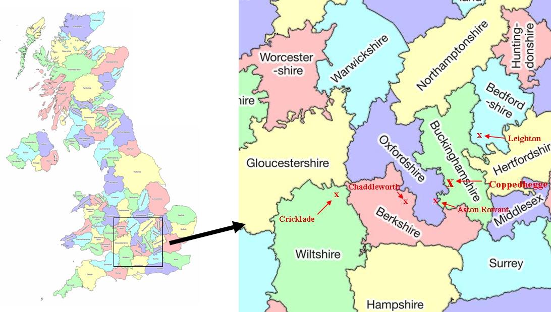 In the late thirteenth century there was a small forest in Buckinghamshire called "Coppedhegge" near the border with Oxfordshire and now part of Bernwood Forest. Coppedhegge comes from the Anglo-Saxon "Copedehecg" and given that the Saxon terms "cop" and "Hecg" mean "top" and "forest" this suggests a "topped forest" or "forest on a rise". Only three inhabitants were recorded in the forest, possibly woodcutters, and it is possible that they bore or were given this surname. What lends credence to this last theory is the striking proximity of the forest to known clusters of bearers of the surname in the sixteenth and seventeenth centuries. The forest is very close to Aston Rowant in Oxfordshire (5 miles), Chaddleworth in Berkshire (15 miles), Leighton in Buckinghamshire (21 miles) and Cricklade in Wiltshire (25 miles). There are numerous records of Copages in all these four settlements.
