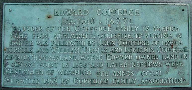 In the US, the Coppage-Coppedge Family Association, formed in 1948, now has several hundred members throughout North America. The association traces the origins of the surname to Edward and William Coppage who migrated from England to America between 1648 and 1652 where they settled in Virginia. Over the years, the association has organised annual family reunions in various locations in the Eastern USA and has helped to distribute the Coppage-Coppedge Family Chronicles. This book was first published in 1955; the third edition is currently under preparation.